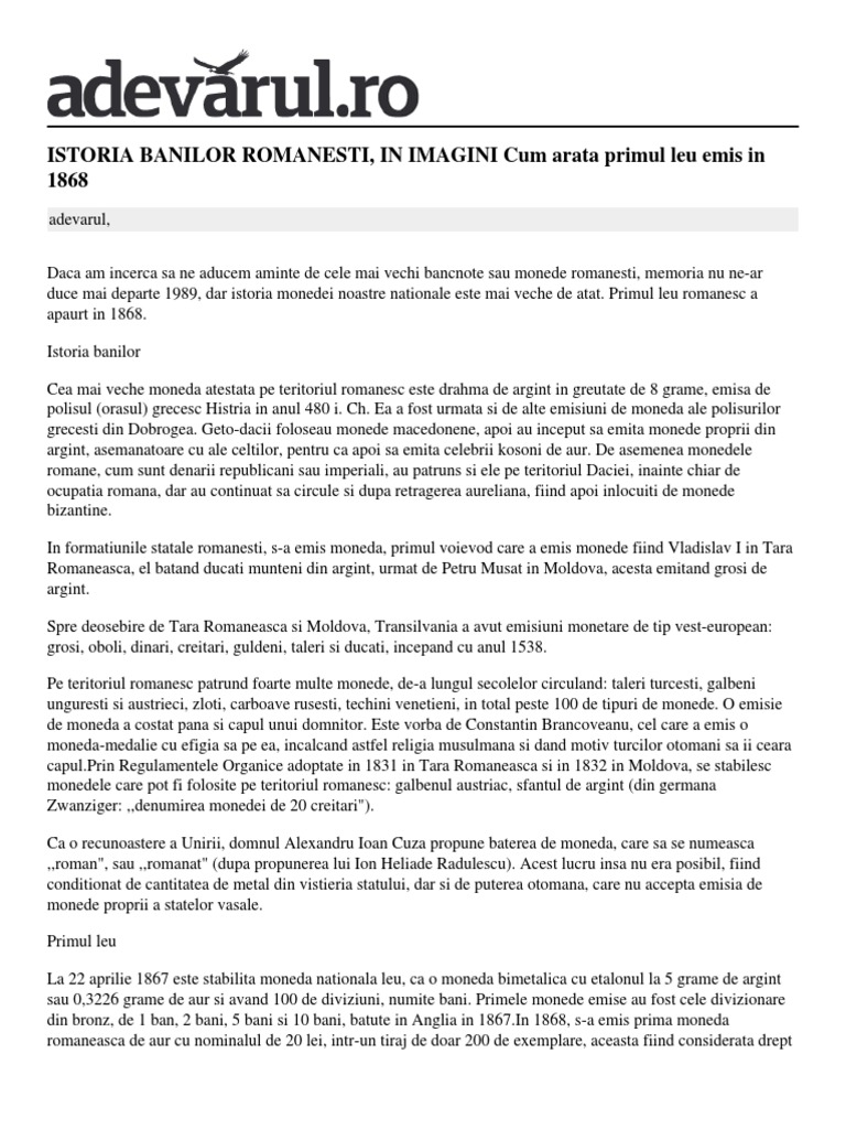 vizitati articolul complet aici : https://momenteistorice.ro/cea-mai-veche-moneda-romaneasca/ Cursul de schimb pentru vechiul leu românesc a fost actualizat la 5, 2021, iunie de la yahoo finance. Aderarea la ue va aduce cadrul legal potrivit pentru tranzactiile cu monede, iar piesele romanesti vor ajunge la valoarea celor straine, datorita raritatii lor. Banul de mare pret, 4 iulie.
